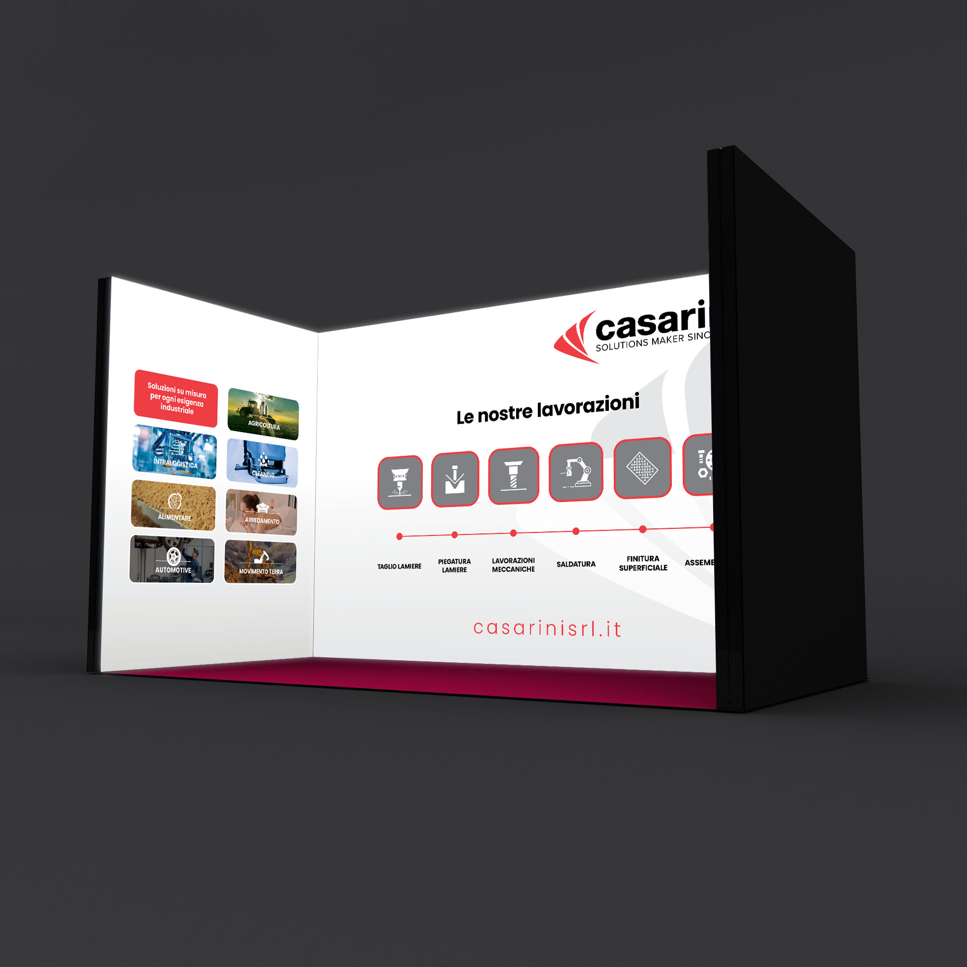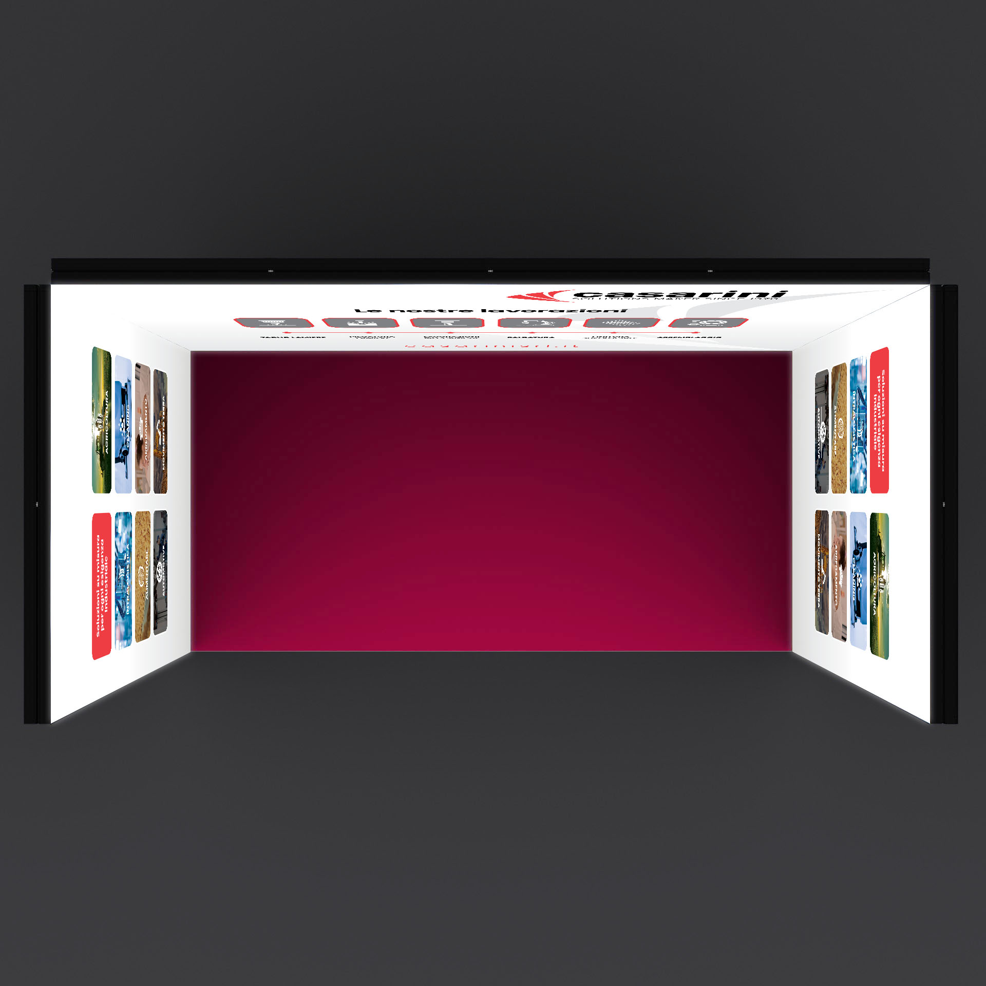 Stand “Cubo” retroilluminato modulare formato da n.1 parete di formato cm 370×250 e n.2 pareti di formato cm 185×250. Formato totale a terra: cm 394x197x250h.