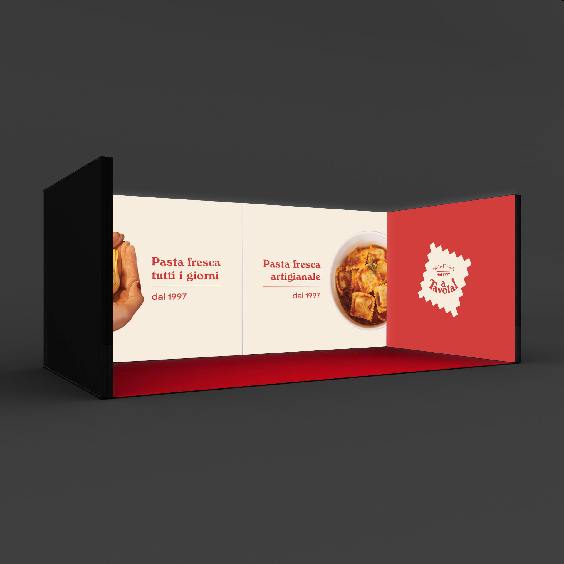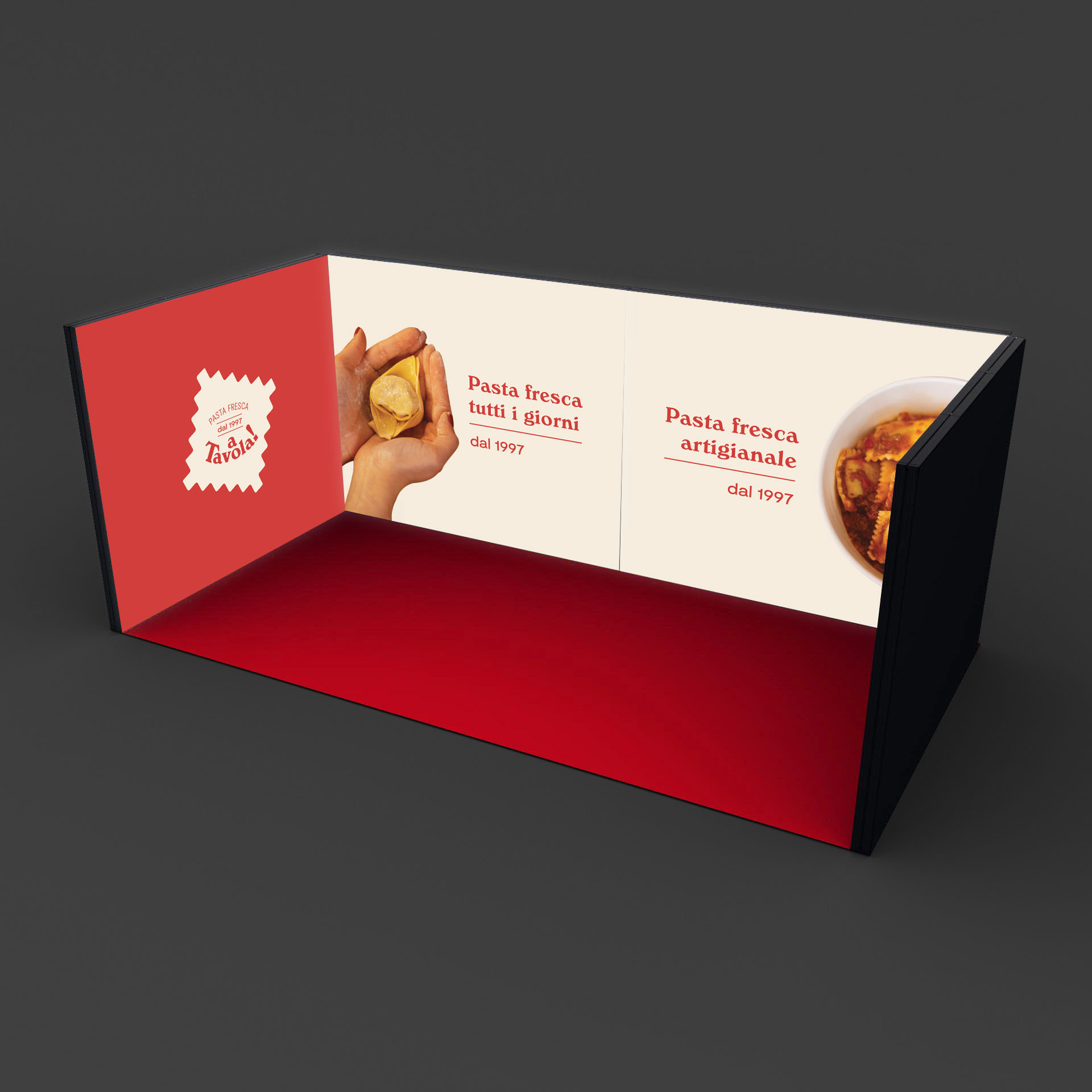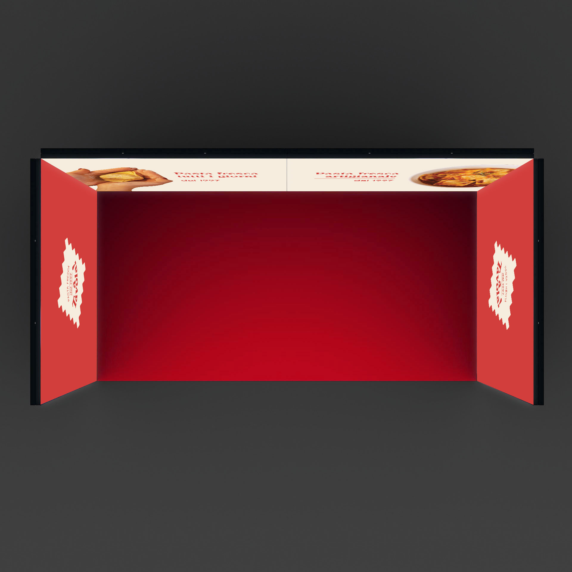 Stand “Cubo” retroilluminato modulare formato da n.4 pareti di formato cm 285×250. Formato totale a terra: cm 594x297x250h.
