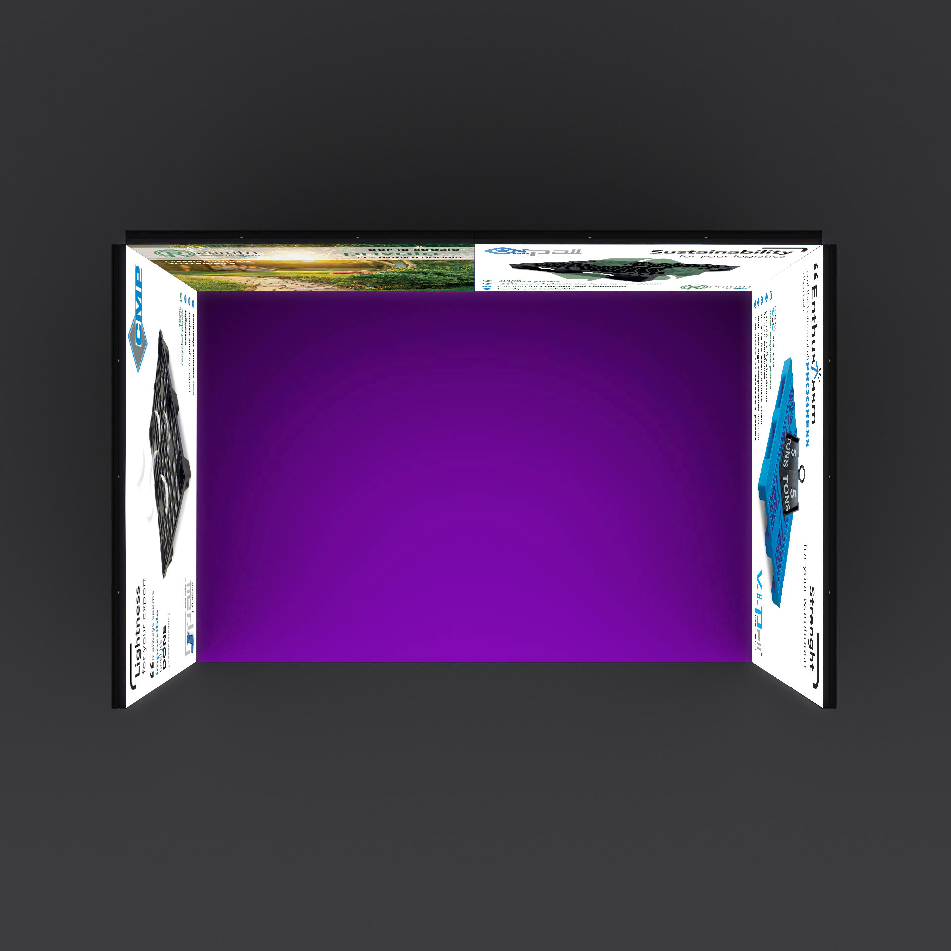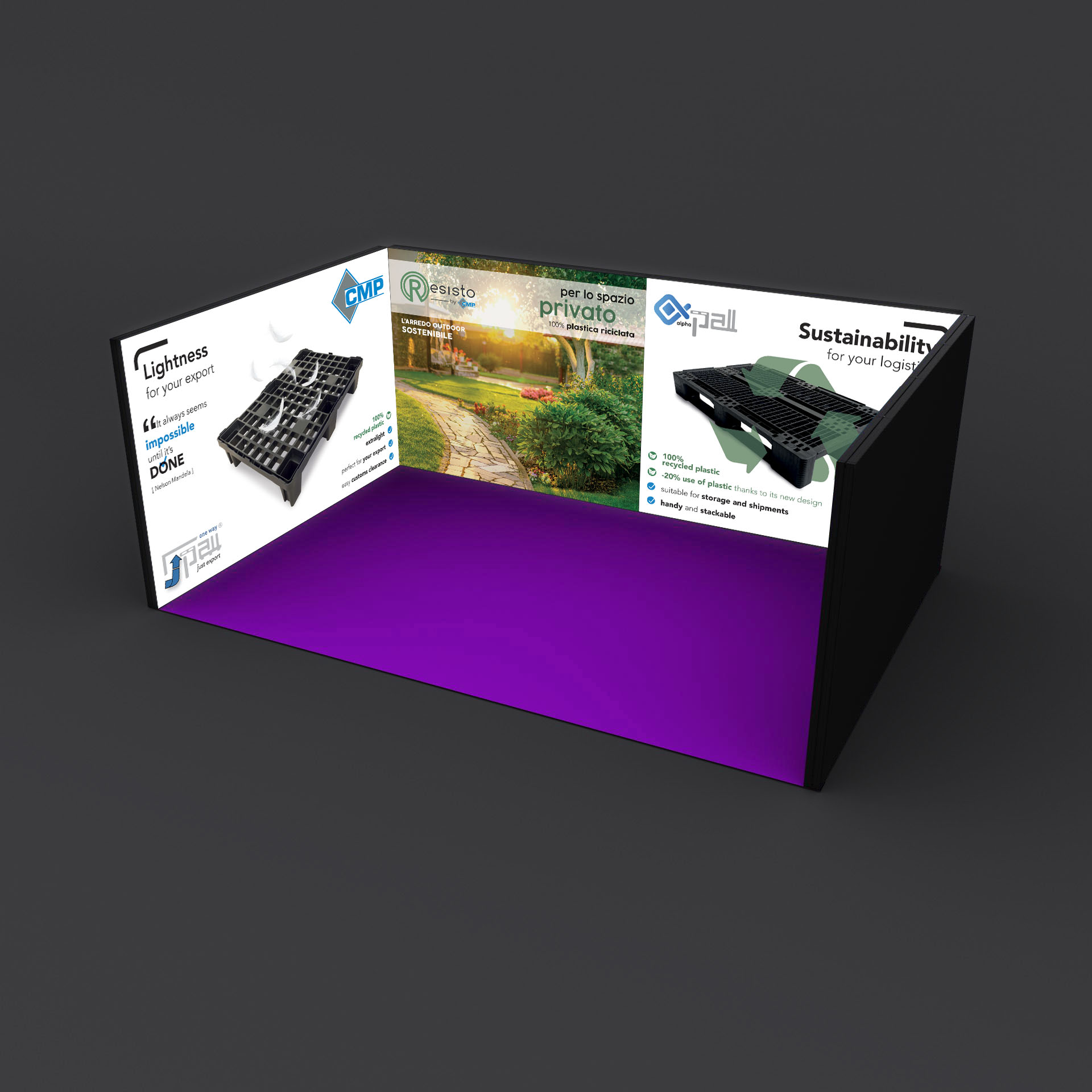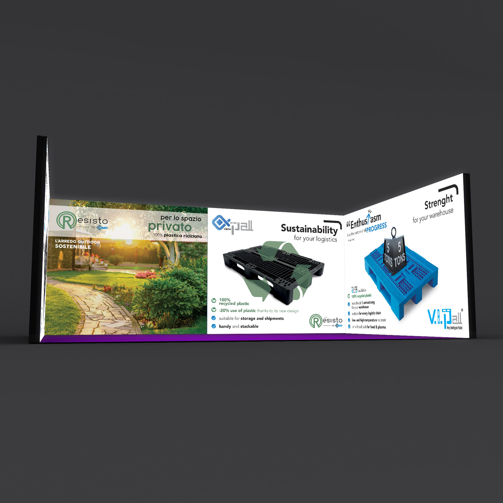 Stand “Cubo” retroilluminato modulare formato da n.2 pareti di formato cm 285×250 e n.2 pareti di formato cm 385×250. Formato totale a terra: cm 594x397x250h.