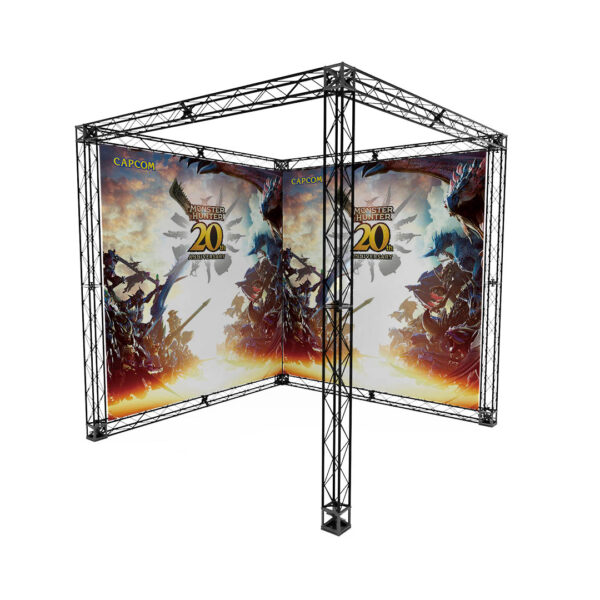 Stand angolare 2 lati aperti di cm 300x300x300h (misura esterna). Dotato di colonna angolare e crowner superiori per alloggiamento faretti o di un eventuale frontalino stampato.