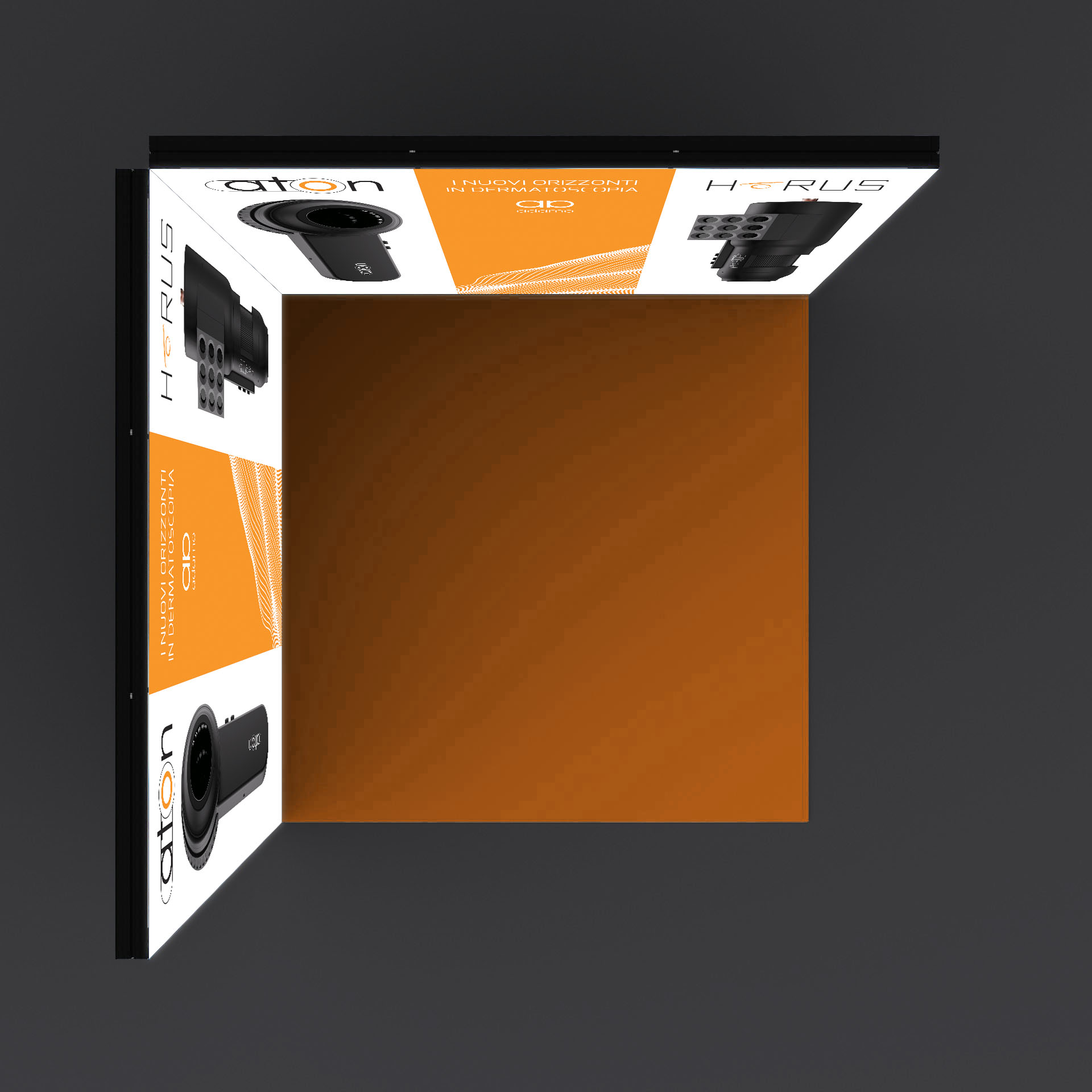 Stand “Angolare”, 2 lati aperti, retroilluminato modulare formato da n.2 pareti di formato cm 285×250. Formato totale a terra: cm 297x297x250h.