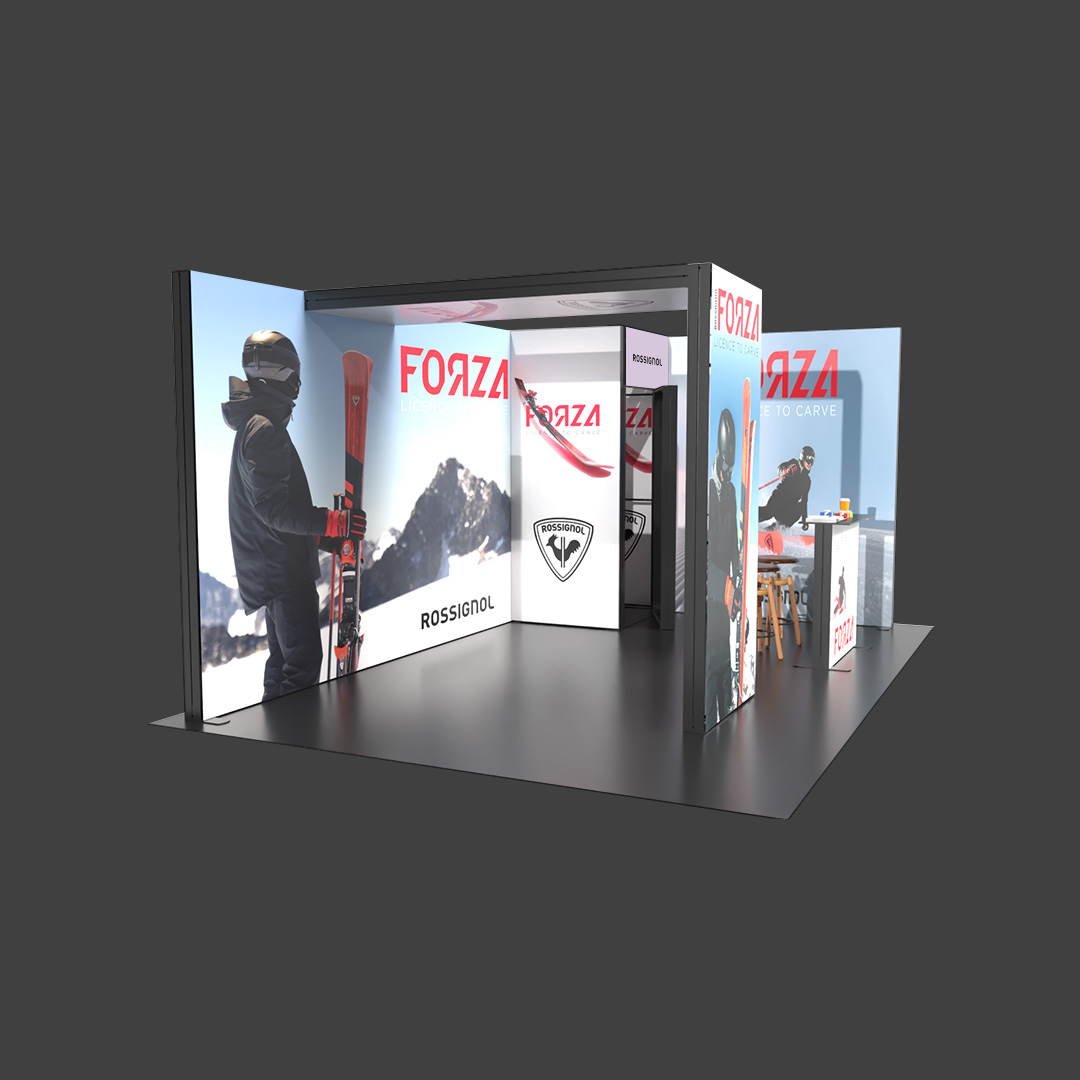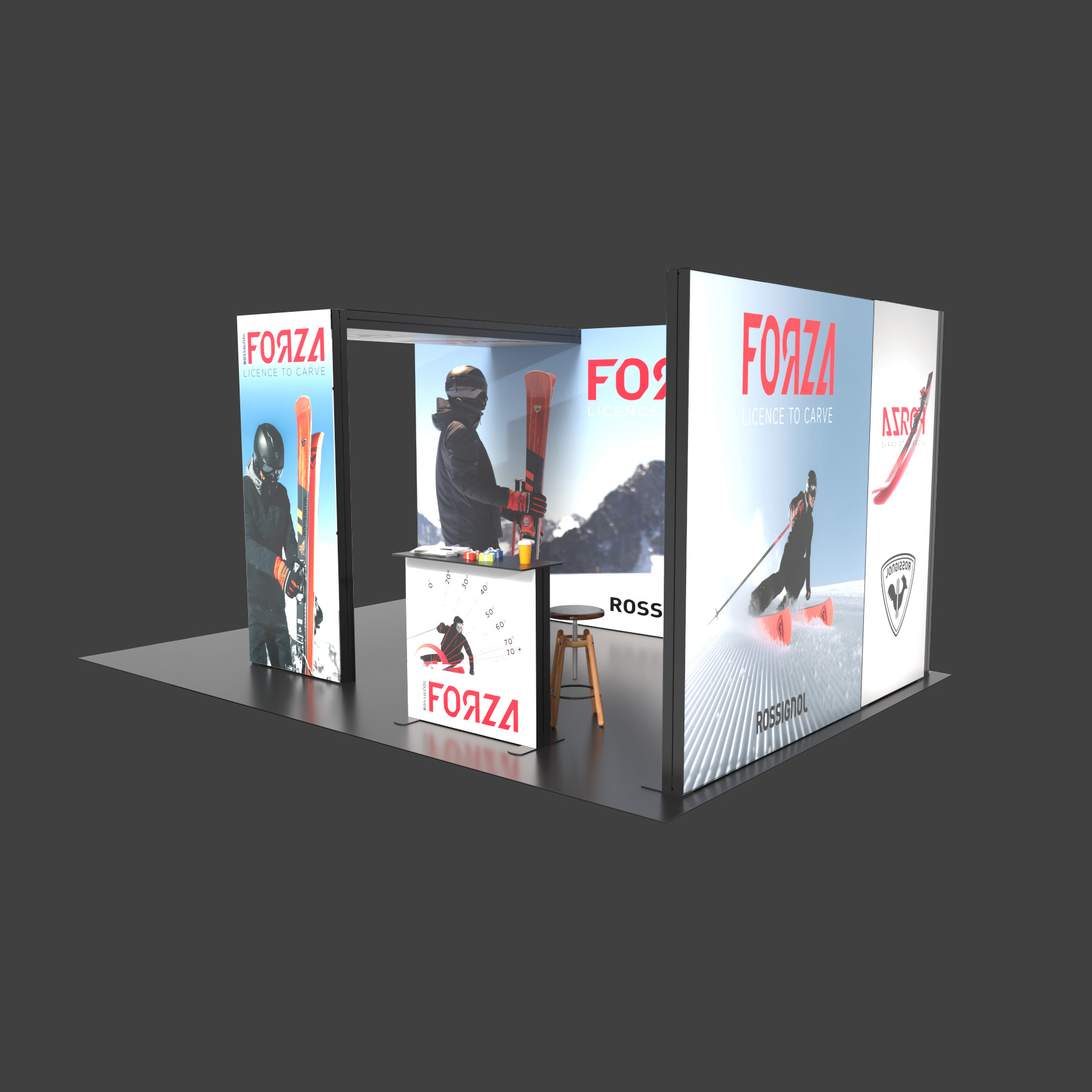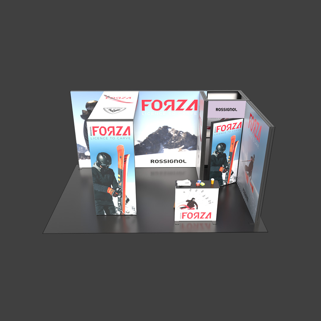 Stand “Angolare” con sgabuzzino, ponte e desk promozionale, retroilluminato modulare formato da: n.1 parete di formato cm 400×250, n.1 pareti di formato cm 200×250, n.5 pareti di formato cm 100×250, n.1 banchetto di formato cm 100×100, n.1 parete porta con frontalino di formato cm 100×250 (200cm altezza porta più 50cm altezza frontalino). Formato totale a terra: cm 500x312x250h.